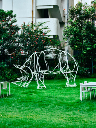 広場には、触れることのできるアニマルフレームアート。今にも動き出しそうなダイナミックさと白いワイヤーゆえの美しさが、広場はもちろん周囲の街並に調和。日常になじむアートがあります。